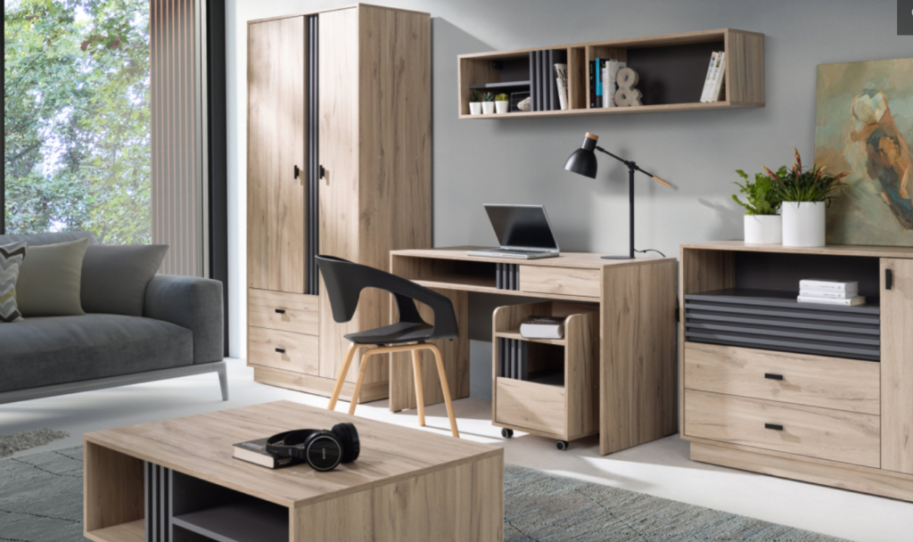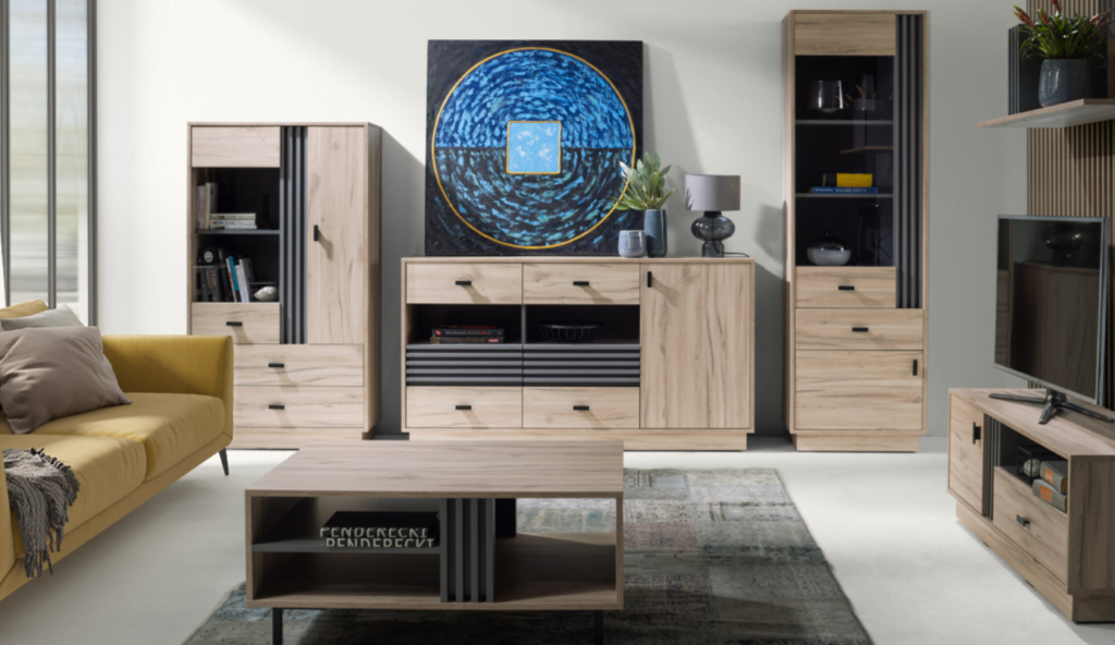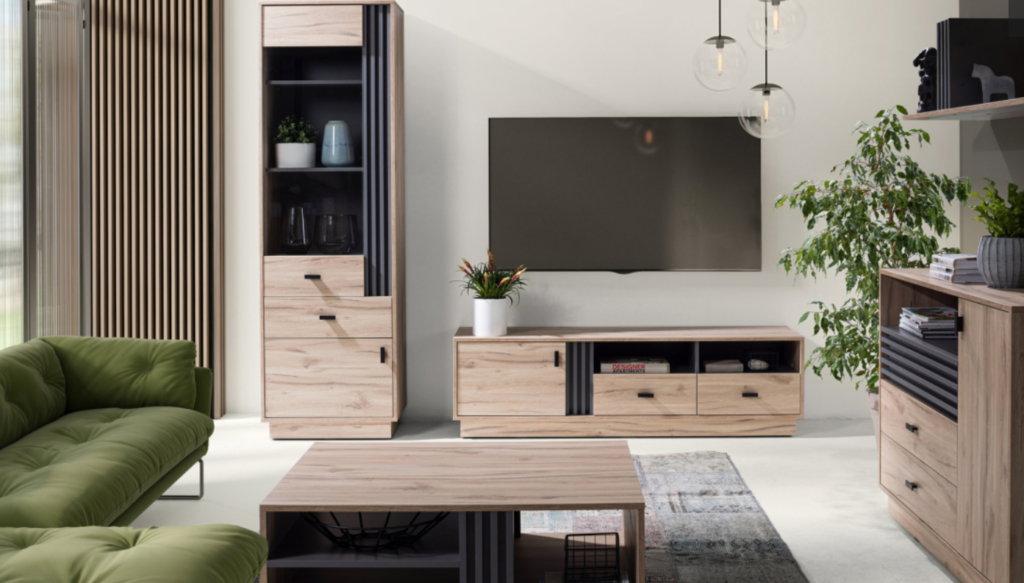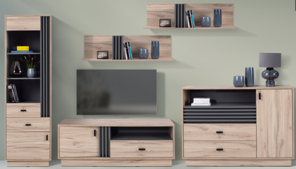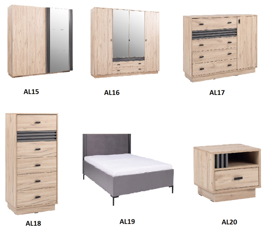 stolik kawowy AL14, komoda AL8, regał AL3, regał AL4, szafka RTV AL6 oraz półka wisząca AL13.