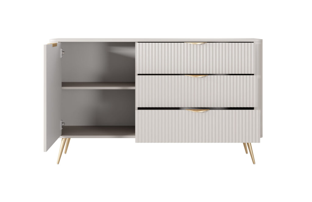 Zestaw Lante pozwoli Ci stworzyć pełną harmonii i delikatności, a jednocześnie modną i szykowną aranżację. Ciepły beż wprowadza do wnętrza spokój i równowagę, doskonale komponując się ze złotymi akcentami, co czyni pomieszczenie przytulnym, a zarazem eleganckim. Natomiast zaoblone krawędzie i ryflowane fronty dodają meblom nowoczesności i oryginalności. W regale na plecach zastosowano płytę HDF w kolorze beżowym ze strukturą drewna. Lante to zestaw stworzony dla tych, którzy uwielbiają nowoczesne formy i subtelną kolorystykę w wydaniu „glamour”.