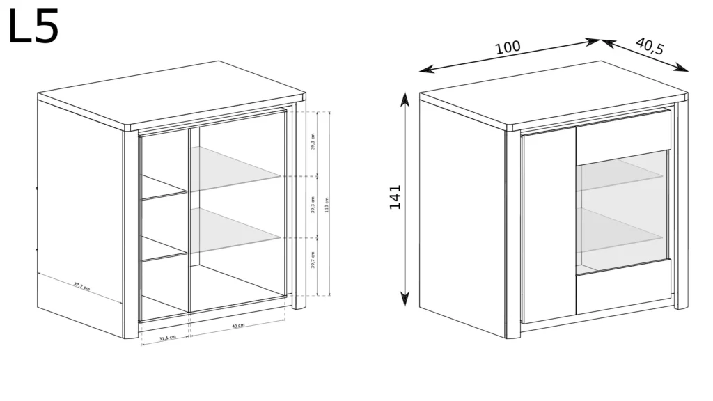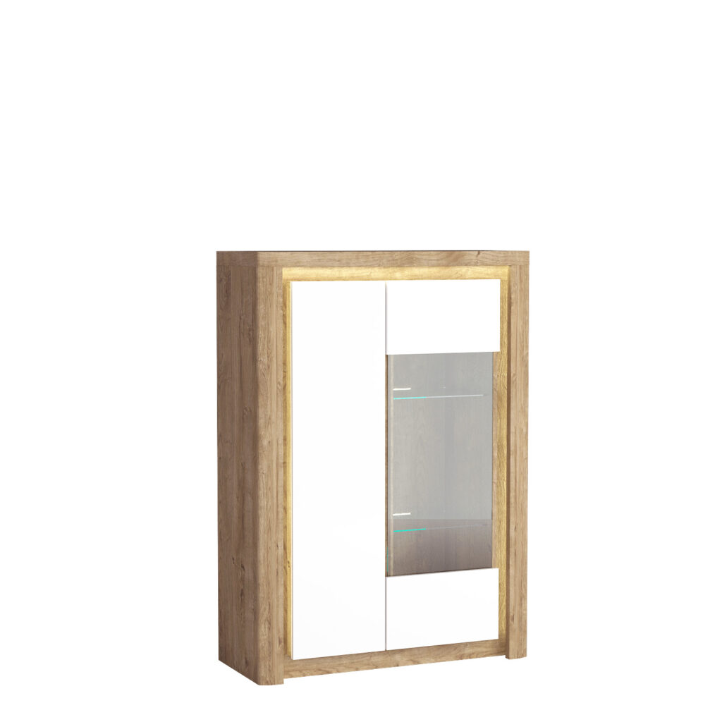 Przeszklona witryna L-5 w kolorze ribbeck z białymi frontami w połysku. Witryna podzielona została na dwie część, po prawej znajdziemy drzwi z bezpieczną, hartowaną szybą, a w środku dwie szklane półki, które możemy podświetlić LEDami. Lewa strona to szafa z pełnymi drzwiami z laminowanej płyty meblowej. W środku znajdziemy dwie półki. Witryna posiada zawiasy z cichym domykiem. Szafa ta doskonale będzie pasować w salonie czy jadalni obok innej komody z tej samej kolekcji.
