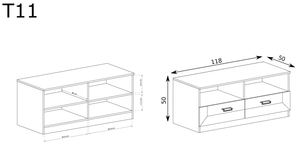 Mała, kompaktowa szafka RTV T-11 pod telewizor. Na dole znajdują się szuflady na drobiazgi oraz dwie półki na których może stać np. dekoder lub konsola.
