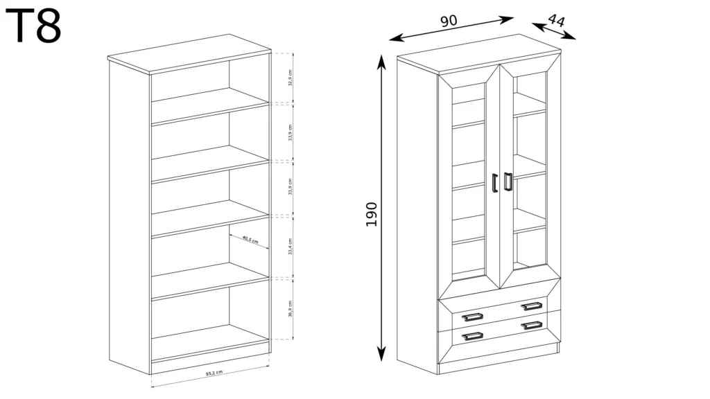 Witryna T-8 dwudrzwiowa to kolejny mebel z kolekcji TADEUSZ. Górna część to przeszklone drzwi z eleganckim wzorem. Dolną część zapełniają dwie szuflady, w których możemy przechowywać np. sztućce lub serwetki. Witryna sprawdzi się w salonie i w jadalni, eksponując rzeczy najbardziej dla nas cenne. Całości dopełniają eleganckie, metalowe uchwyty.