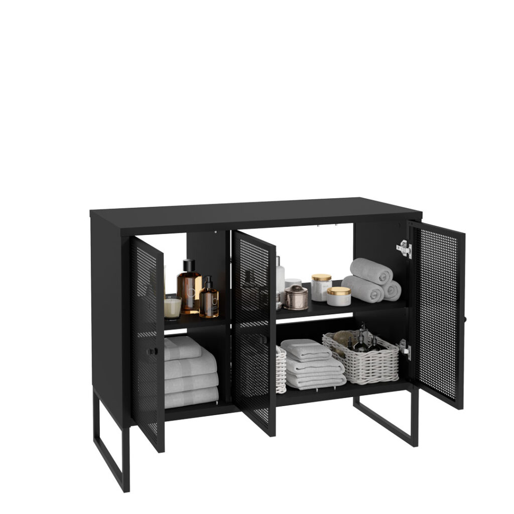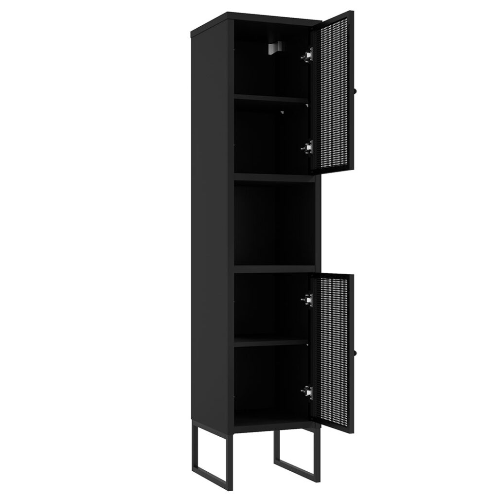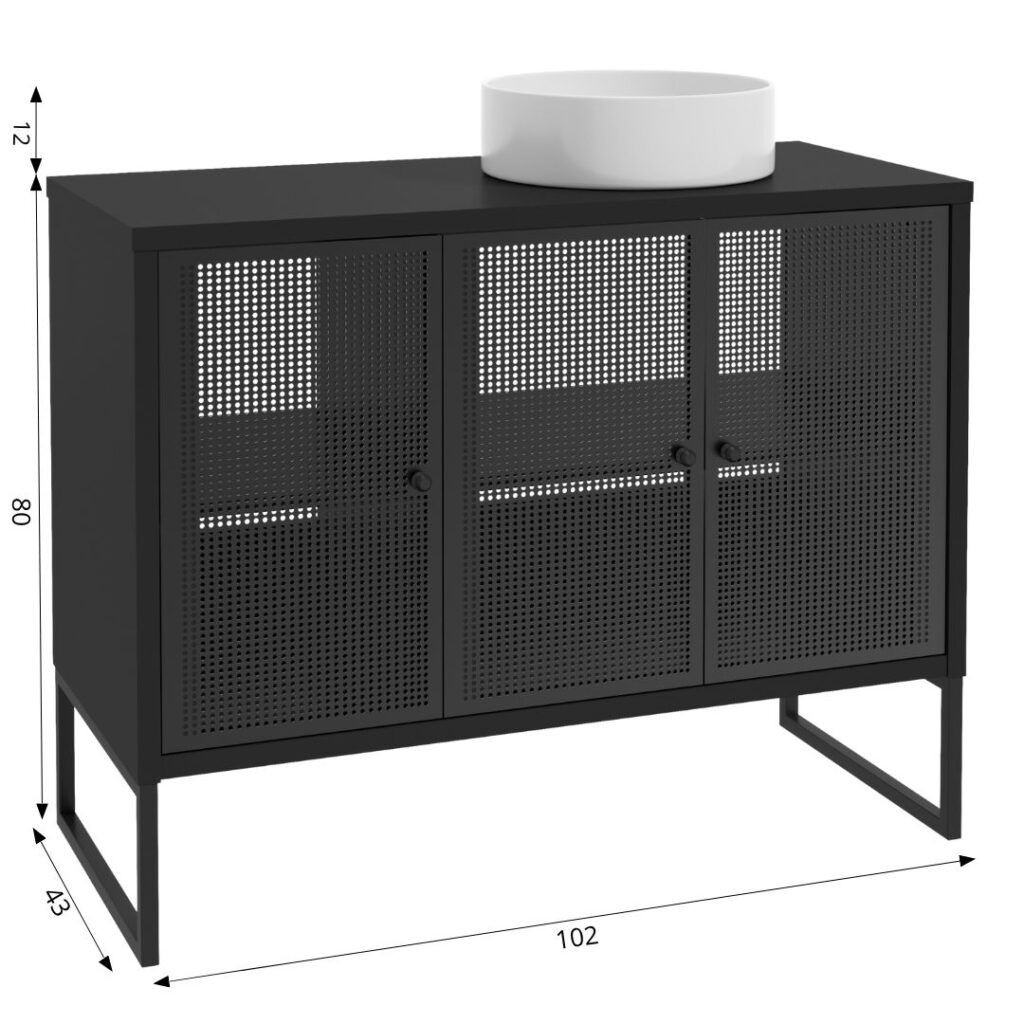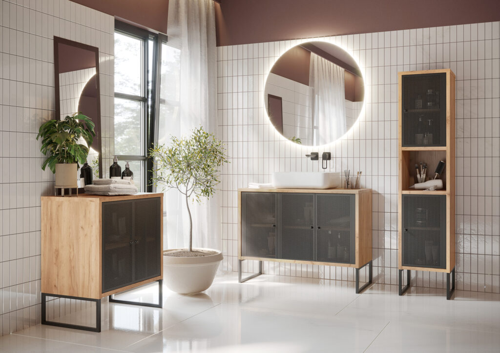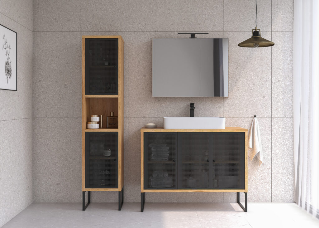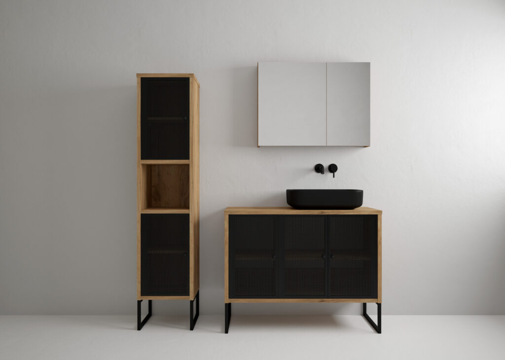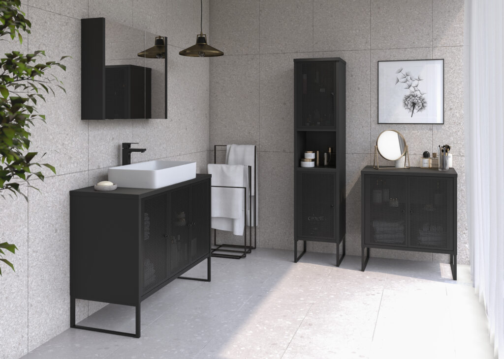 Meble łazienkowe FIORA to modny i stylowy element wyposażenia nowoczesnych łazienek. Wyrazisty charakter mebla to zasługa malowanych proszkowo, ażurowych frontów wykonanych z metalu oraz geometrycznych nóżek. Ten duet świetnie komponuje się z czarnym dekorem zastosowanym na korpusie. Takie połączenie będzie się znakomicie prezentować w minimalistycznych łazienkach, zwłaszcza tych o loftowym designie.