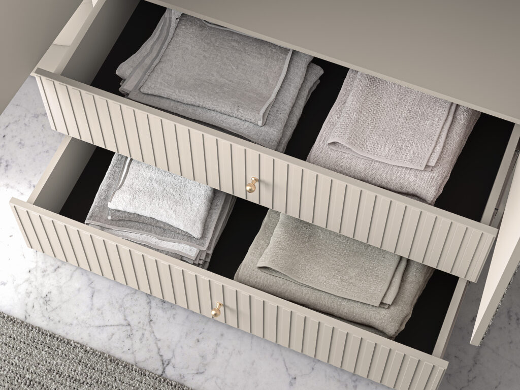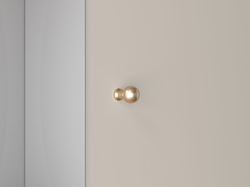 Kaszmirowy dekor to niebanalny i ponadczasowy kolor, nazywany nowym białym. Frezowane fronty MDF podkreślają wyrafinowanie i elegancję całej kolekcji. Dyskretne czarne nóżki dodają bryłom efektownej lekkości. Kropką nad i, dodatkowo budującą estetykę wszystkich mebli Sophie są uchwyty ze szczotkowanego metalu, w złotym wybarwieniu.