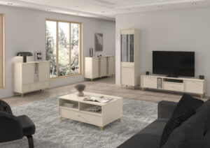 W skład zestawu wchodzi komoda 825, komoda 823, witryna przeszklona 101, szafka RTV 313 oraz stolik kawowy.