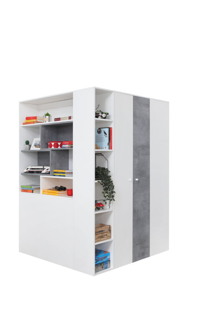 Zestaw mebli młodzieżowych Sigma System A w kolorze beton / biały lux / dąb. Cena nie obejmuje materaca.