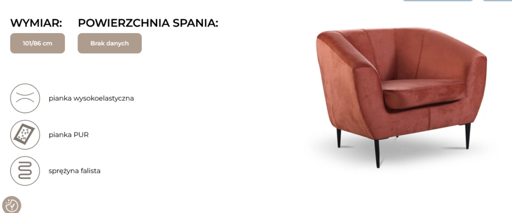 Komfort użytkowania gwarantują poduszki siedziskowe, których wnętrza zawierają między innymi pianki poliuretanowe, pianki wysokoelastyczne oraz sprężyny faliste.